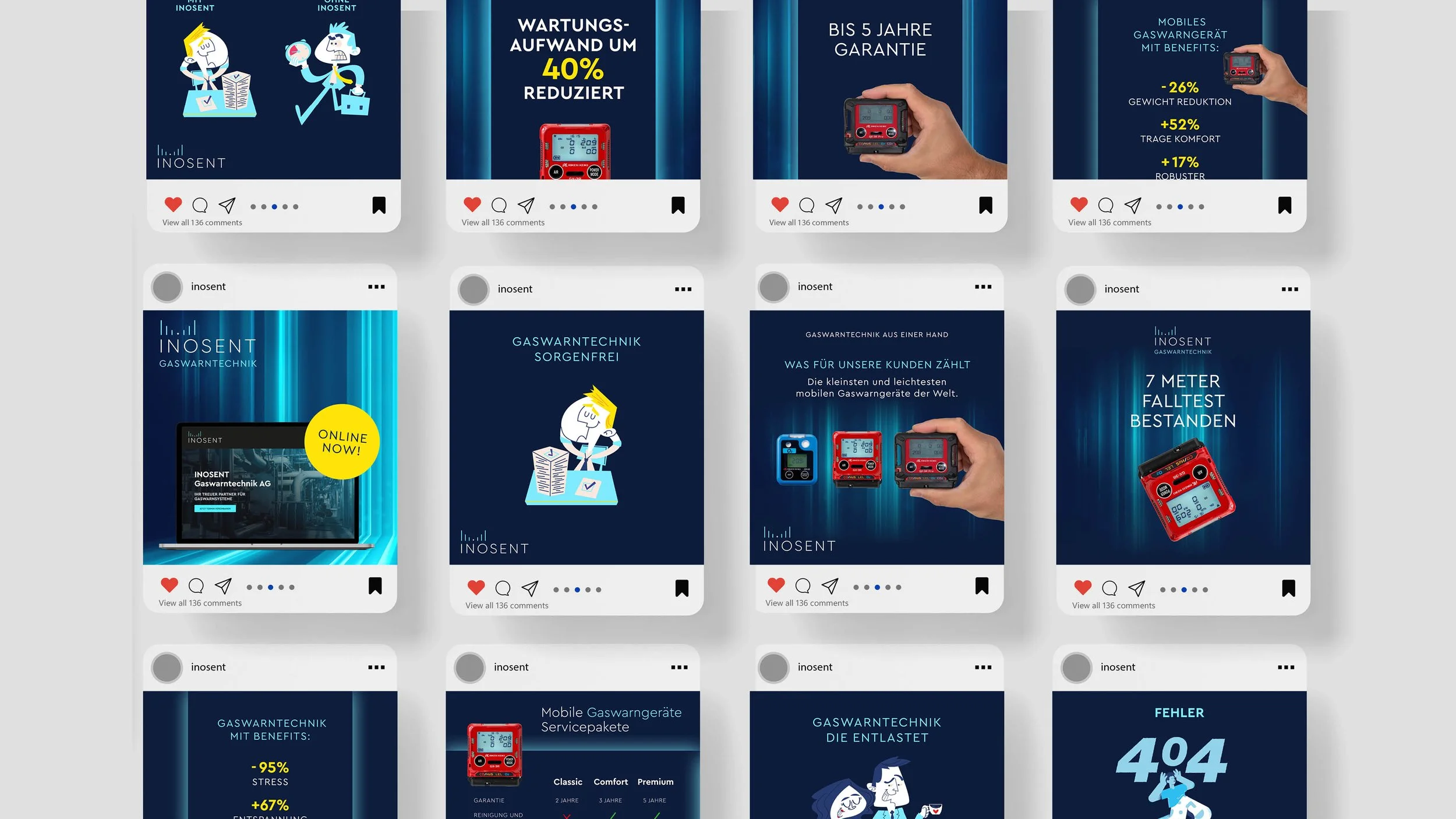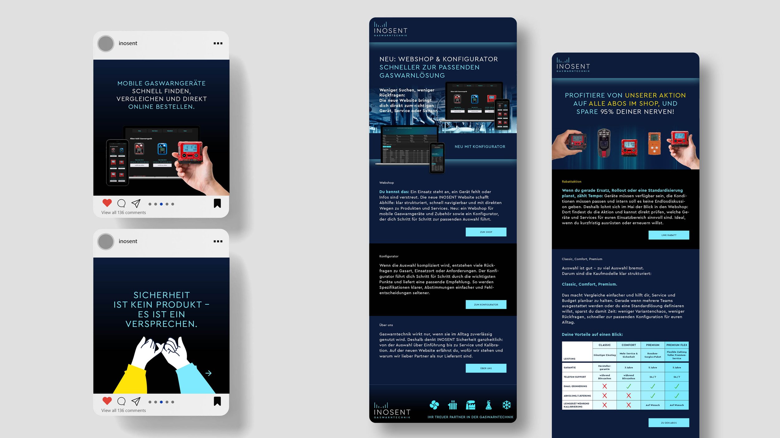 Inosent entwickelt und vertreibt innovative Gaswarntechnik für Industrie und Gewerbe. Seit über zehn Jahren begleitet das Studio Murschetz das Unternehmen in der visuellen Kommunikation und hat das Corporate Design massgeblich geprägt. Ziel der aktuellen Zusammenarbeit war es, die den neuen Webshop in einer digitalen Kampagne zeitgemäss zu präsentieren und neue Zielgruppen anzusprechen.